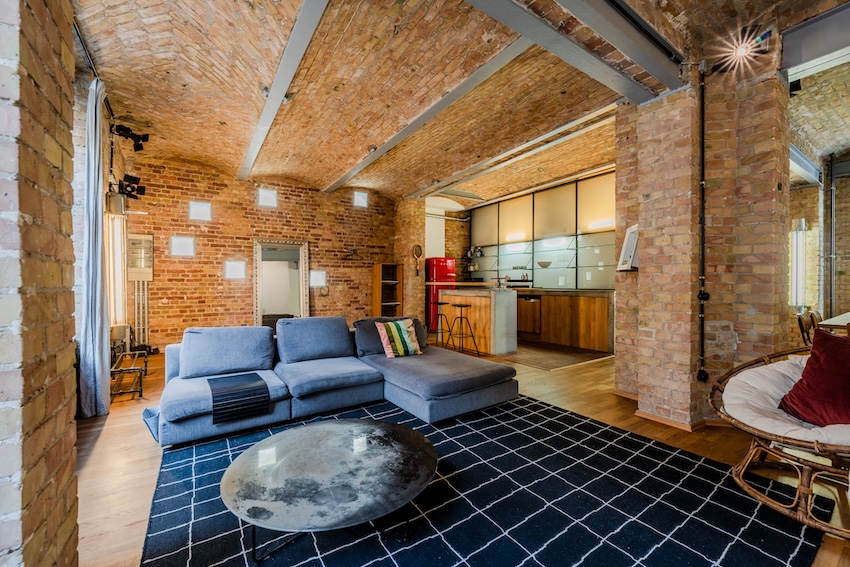 Discover spacious design and refined style in this 207 sqm loft apartment. The space combines modern aesthetics with industrial charm, featuring exposed brick walls and vaulted ceilings. The master bedroom, with its own entrance, includes a large en-suite bathroom with both a tub and shower. A second twin bedroom offers a perfect setup for guests or children.