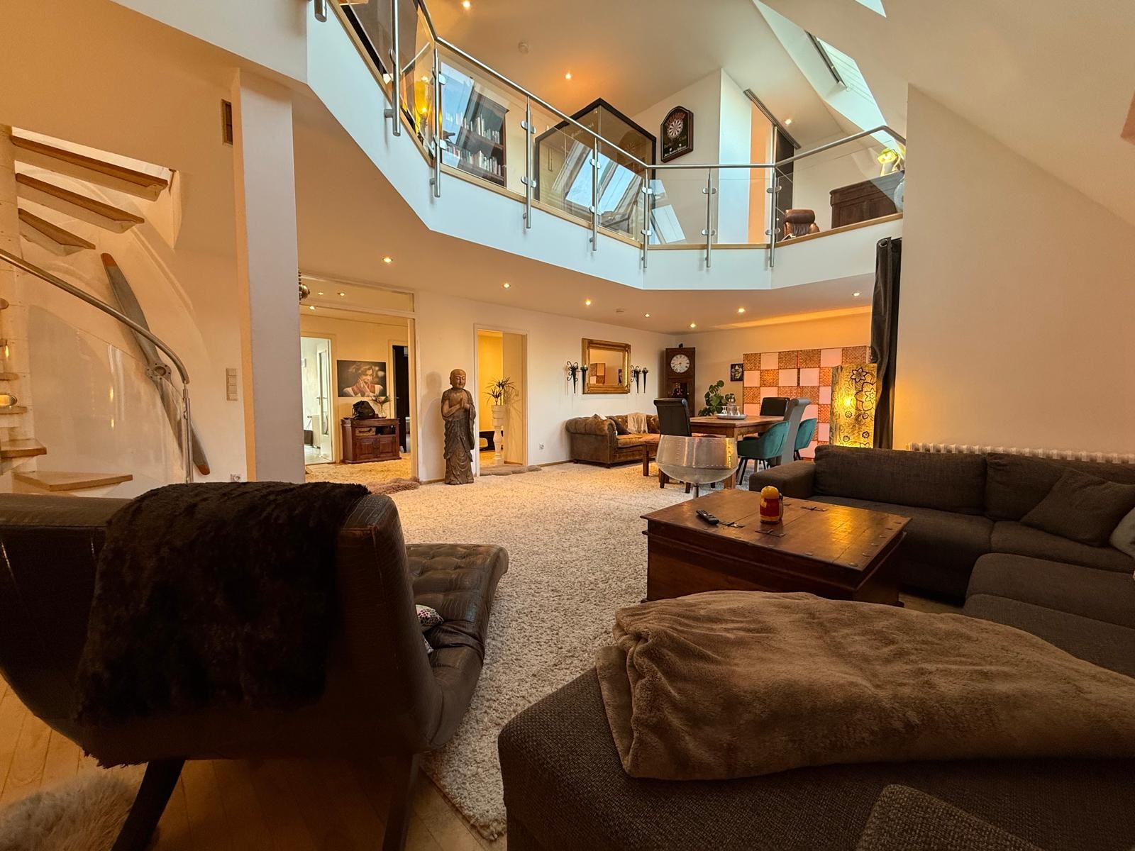 Stylish industrial-chic loft on the 2nd floor with open living, dining, and kitchen area featuring a concrete-wood kitchen and terracotta tiles. The bright space offers parquet floors, a master bedroom with balcony and freestanding bathtub, a second bedroom, and two bathrooms. Fully equipped and freshly renovated, it’s ready for immediate move-in. setup for guests or children.